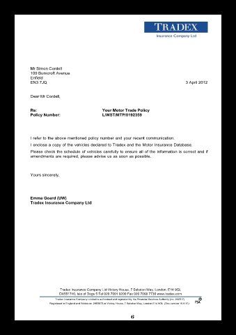I enclose a copy of the vehicles declared to Tradex and the Motor Insurance Database.
