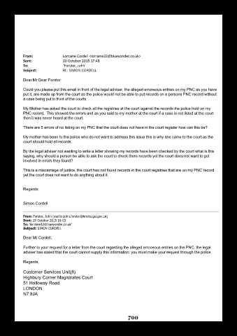 Further to your request for a letter from the court regarding the alleged erroneous entries on the PNC, the legal