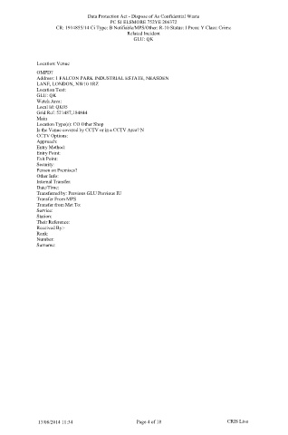 PC SJ ELSMORE 752YE 206372 Data Protection Act - Dispose of As Confidential Waste CR: 1914855/14 Cr Type: B Notifiable/MPS/Other: R-l 0 Status: I Press: Y Class: Crime Related Incident GLU: QK Support Services Page 5 of 18