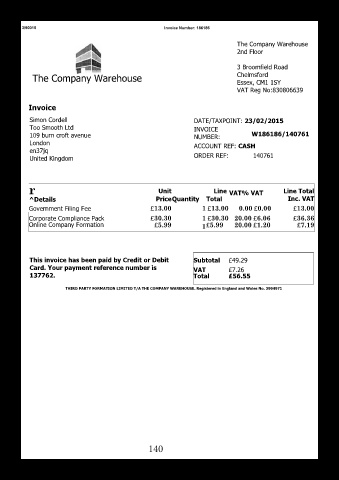 Simon Cordell DATE/TAXPOINT: 23/02/2015 109 burn croft avenue INVOICE NUMBER: W186186/140761