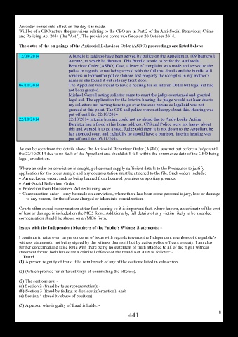 The dates of the on goings of the Antisocial Behaviour Order (ASBO) proceedings are listed below: -