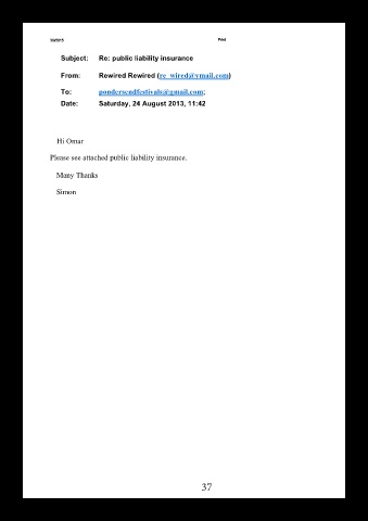 3/9/2015 Print Subject: Re: public liability insurance From: Rewired Rewired (re_wired@ymail.com) To: pondersendfestivals@gmail.com; Date: Saturday, 24 August 2013, 11:42 Hi Omar Please see attached public liability insurance. Many Thanks Simon 37