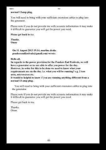 In regards to the power provision for the Ponders End Festivals, we will