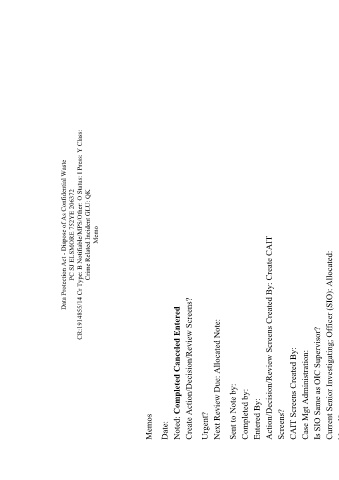 Noted: Completed Canceled Entered Create Action/Decision/Review Screens? Next Review Due: Allocated Note: Action/Decision/Review Screens Created By: Create CAIT CAIT Screens Created By: Case Mgt Administration: Is SIO Same as OIC Supervisor? Current Senior Investigating; Officer (SIO): Allocated: