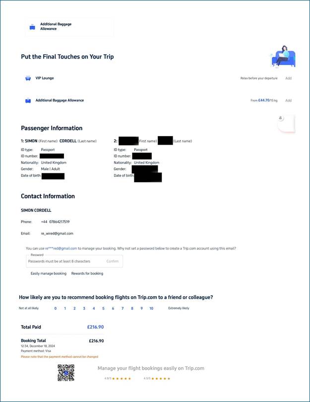 and it takes me to this Tickets (2 Adults): £192.40 Adults (Passenger 1, Passenger 2):