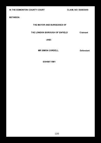 IN THE EDMONTON COUNTY COURT CLAIM, NO: E00ED049 BETWEEN: THE MAYOR AND BURGESSES OF THE LONDON BOROUGH OF ENFIELD Claimant -AND- MR SIMON CORDELL Defendant EXHIBIT RM1 109