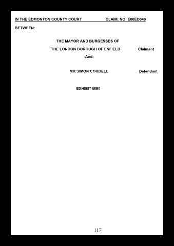 IN THE EDMONTON COUNTY COURT CLAIM, NO: E00ED049 BETWEEN: THE MAYOR AND BURGESSES OF THE LONDON BOROUGH OF ENFIELD Claimant -And- MR SIMON CORDELL Defendant EXHIBIT MM1 117