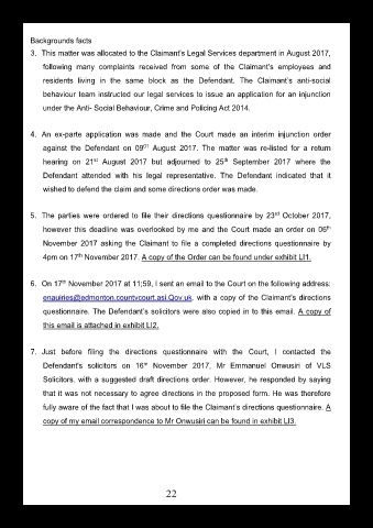 3. This matter was allocated to the Claimant's Legal Services department in August 2017,
