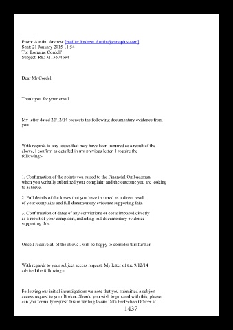 1. Confirmation of the points you raised to the Financial Ombudsman