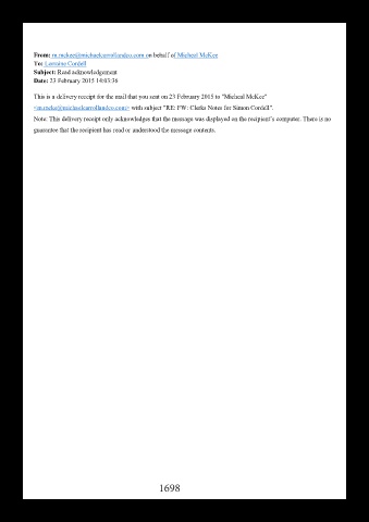 This is a delivery receipt for the mail that you sent on 23 February 2015 to "Micheal McKee"