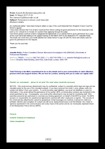 of the court transcript relating to his appeal hearing on 5th March 2015 to be released to PC Jeanette Reilly.