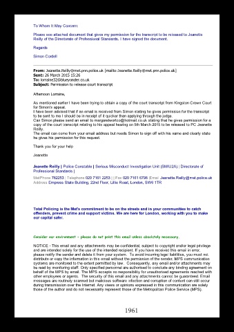 copy of the court transcript relating to his appeal hearing on 5th March 2015 to be released to PC Jeanette