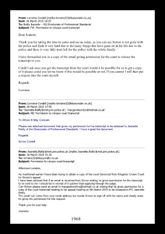 copy of the court transcript relating to his appeal hearing on 5th March 2015 to be released to PC Jeanette