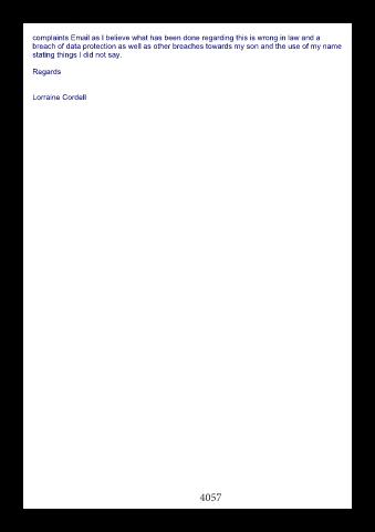 complaints Email as I believe what has been done regarding this is wrong in law and a breach of data protection as well as other breaches towards my son and the use of my name stating things I did not say. Regards Lorraine Cordell 4057