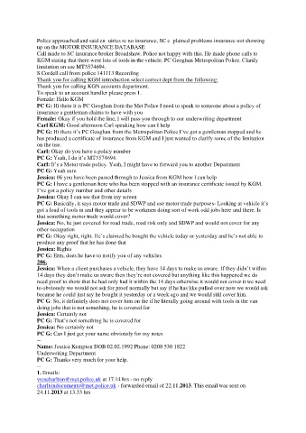 Police approached and said enquiries re no insurance, SC explained problems insurance not showing