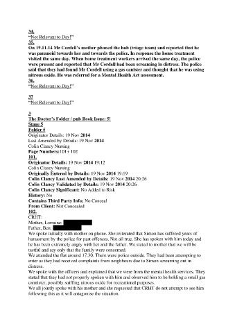 On 19.11.14 Mr Cordell’s mother phoned the hub (triage team) and reported that he