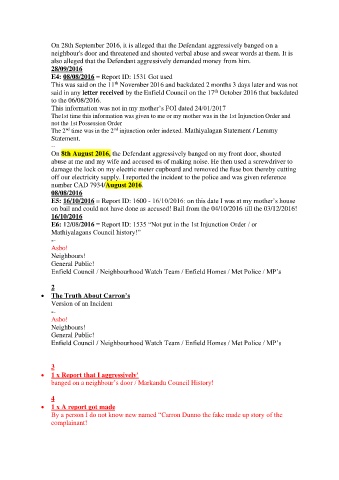 On 8th August 2016, the Defendant aggressively banged on my front door, shouted