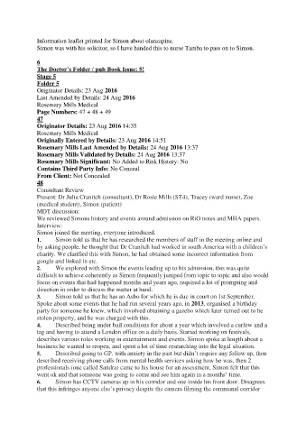 We reviewed Simons history and events around admission on RiO notes and MHA papers.