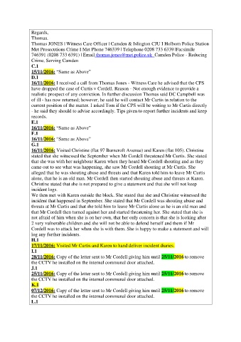 16/11/2016: I received a call from Thomas Jones - Witness Care he advised that the CPS