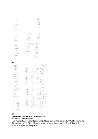 I am writing this down for Simon Cordell to an incident that happen 12/09/2014 around the