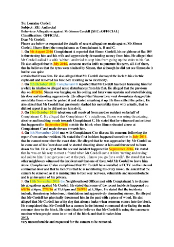 1. On 6th August 2016 Complainant A reported that Simon Cordell, his neighbour at flat 109