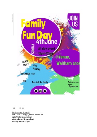 End of picture! The banging Started! Flat – 113 – George Quinton moved in! Stain Curtis (responsible) Mathiyalagan (Responsible) All-Day and All-Night!