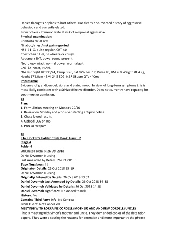 Denies thoughts or plans to hurt others. Has clearly documented history of aggressive