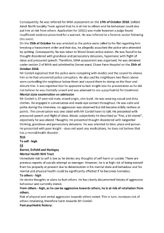 Consequently, he was referred for MHA assessment on the 17th of October 2018. Enfield