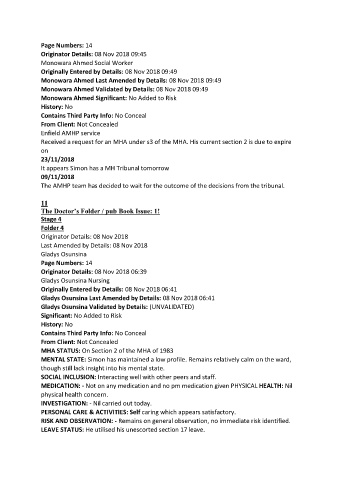 MENTAL STATE: Simon has maintained a low profile. Remains relatively calm on the ward,