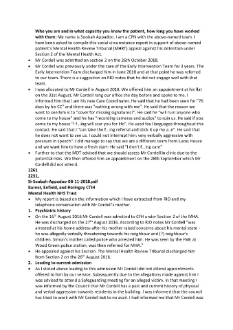 • Mr Cordell was admitted on section 2 on the 26th October 2018.