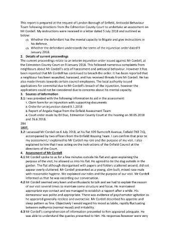 3.2 I assessed Mr Cordell on 6 July 2018, at his flat 109 Burncroft Avenue, Enfield EN3 7JQ,