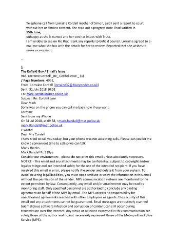 Telephone call from Lorraine Cordell mother of Simon, said I sent a report to court