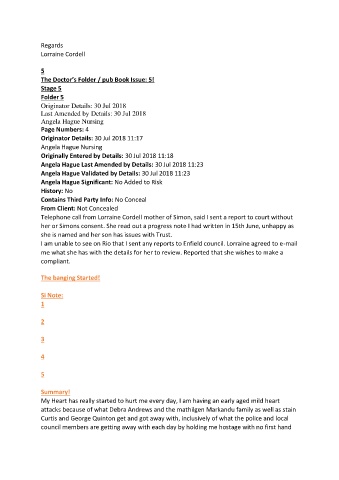 Telephone call from Lorraine Cordell mother of Simon, said I sent a report to court without